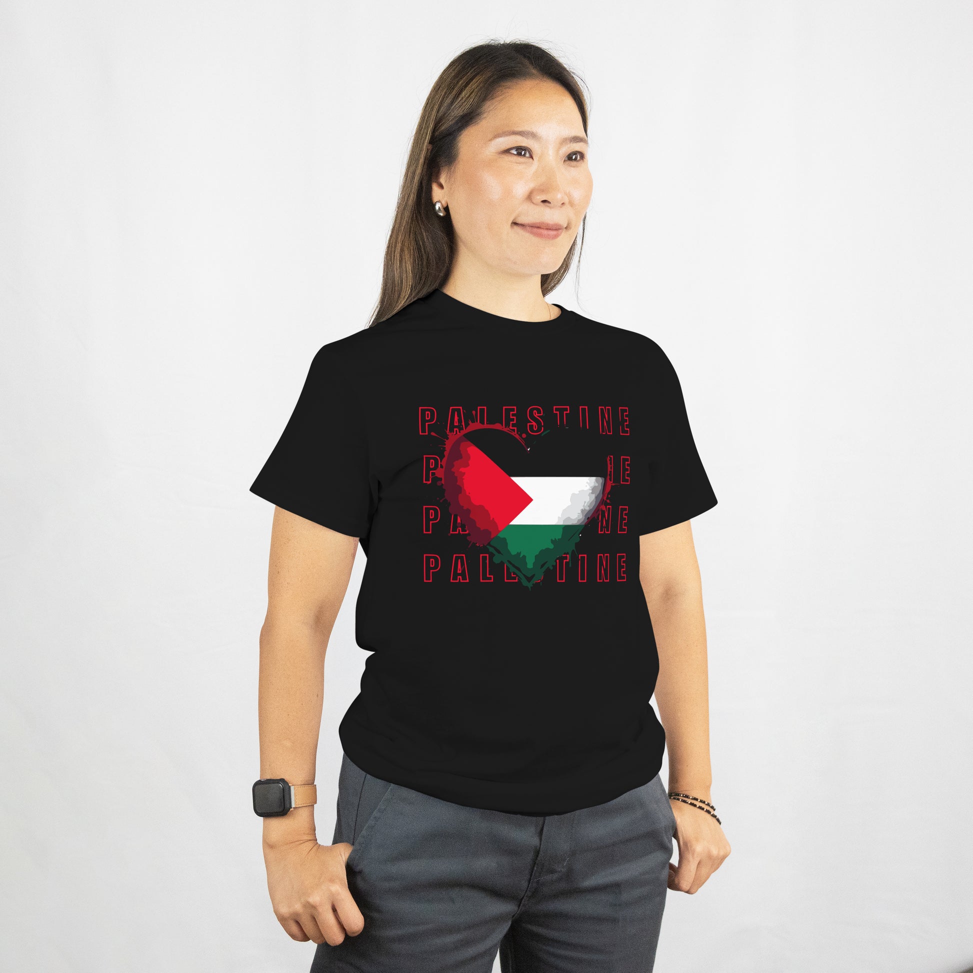 Show your support with our "Palestine Heart" tee, featuring a bold heart-shaped design in the colors of the Palestinian flag layered over repeated "PALESTINE" text. Made from 100% cotton, this shirt offers a soft, breathable fit that’s perfect for everyday wear. Comfortable, meaningful, and stylish—wear your heart on your chest.